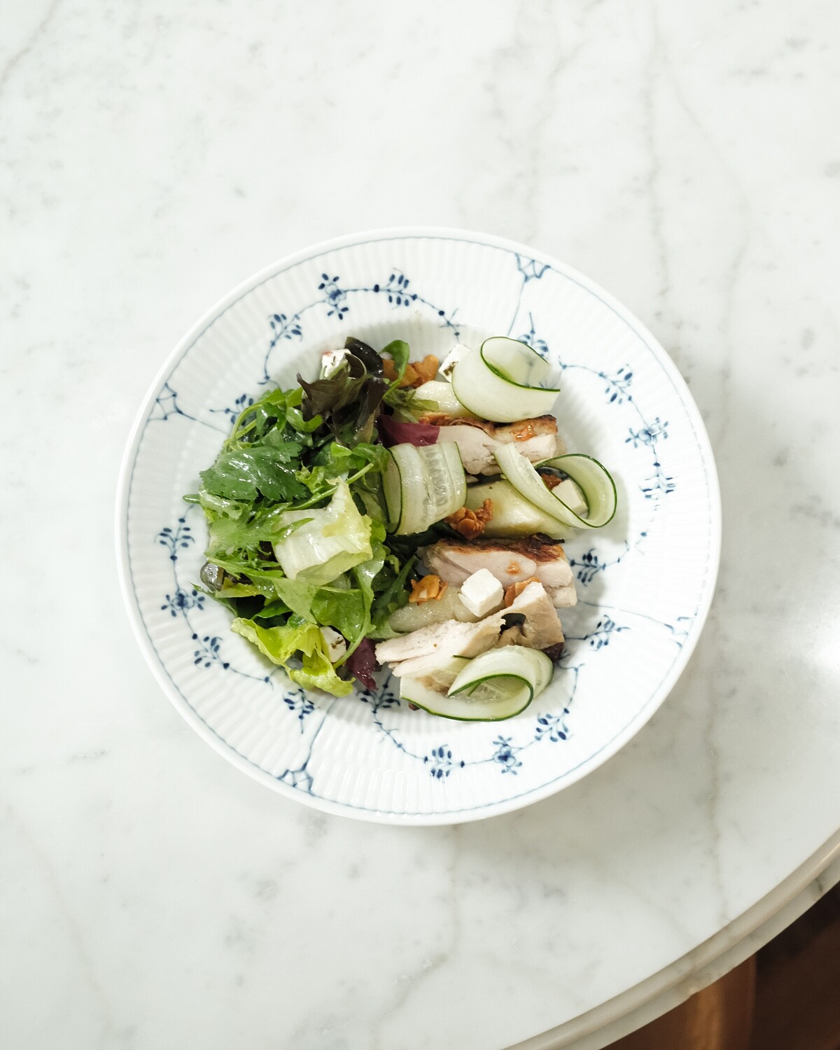 哈密瓜/Feta cheese/小黃瓜/焦糖杏仁/香料烤雞腿/芝麻葉與香菜沙拉