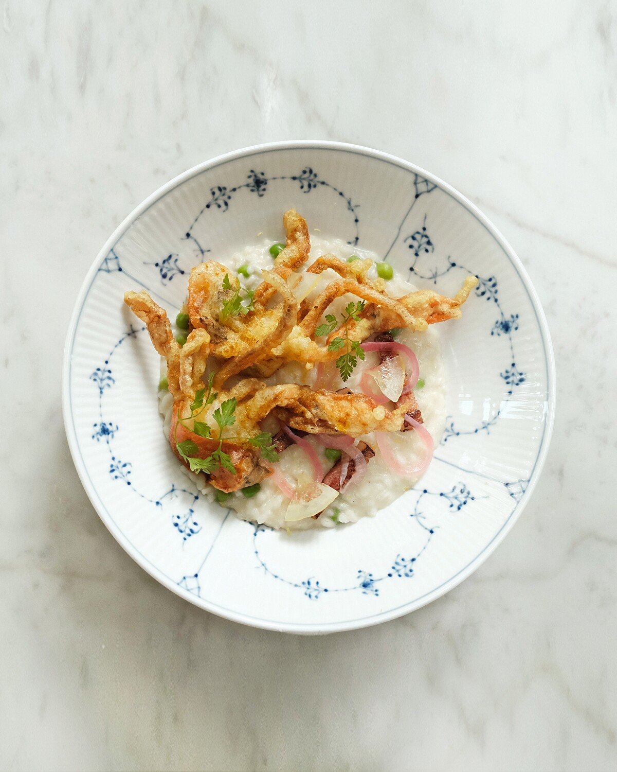 Lemon green peas and parmesan risotto / Crispy fried soft-shell crab, topped with pickled shallots, lemon and bacon bits