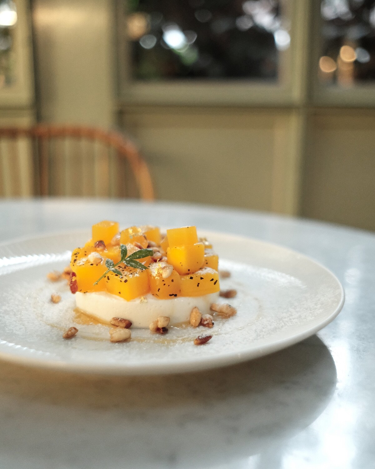 Oolong tea infused no-bake cheese cake / Mango / Passion fruit gelée / Caramelized popcorn / Honey