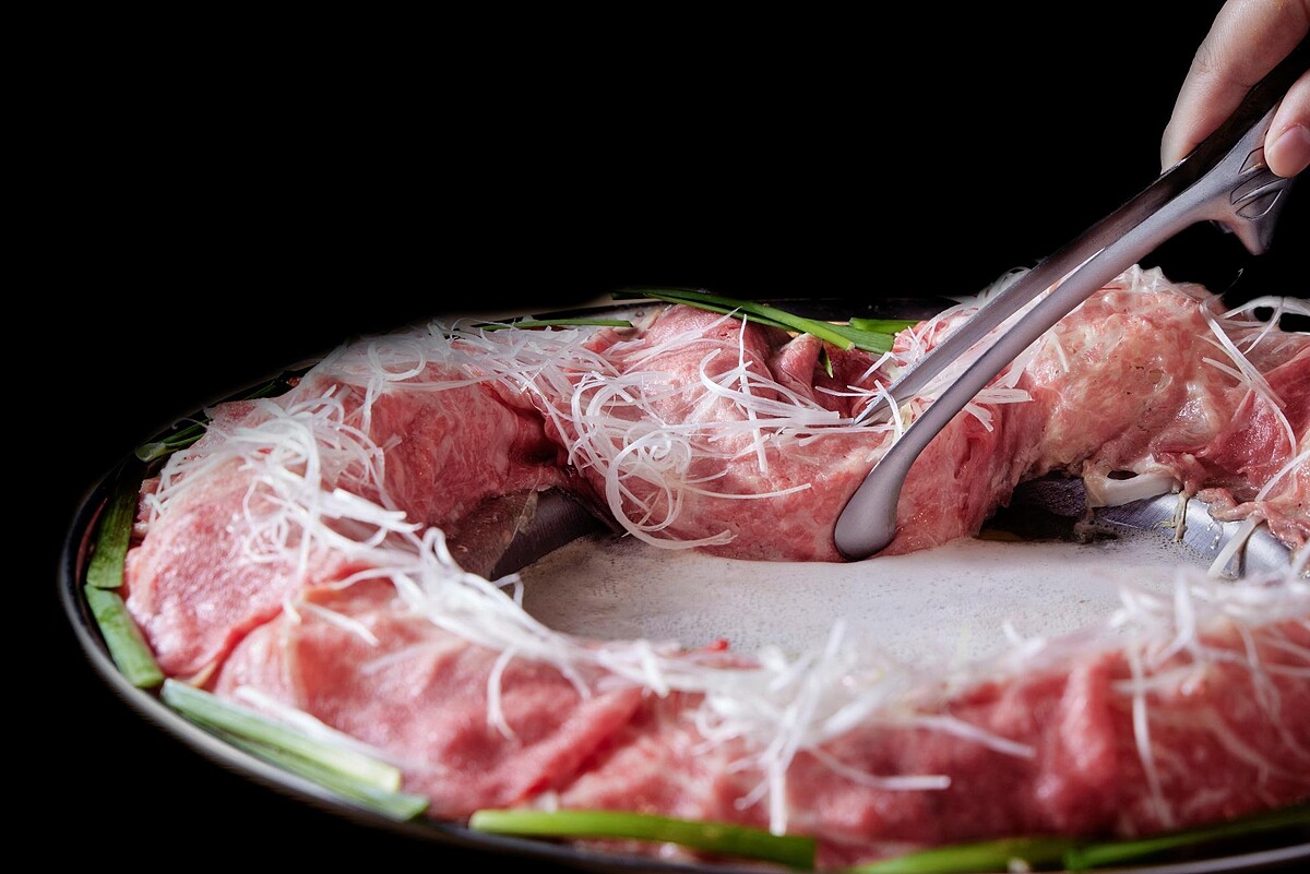 淋上雪白原味山藥泥的日本A5和牛,紅白相間形成令人食指大動的鮮明對比,將和牛涮煮壽喜燒醬汁,與高麗菜絲、蕈菇一起品嚐,細柔化口的肉質,讓人忍不住一口接一口!