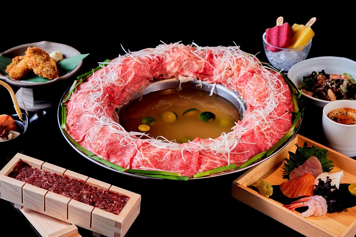 推薦大家在湯滾後,用和牛包捲高麗菜絲、銀芽或是大蔥一起加入熱湯中涮煮,再佐以柑橘醋、胡麻醬,入口感受柔嫩的和牛與清甜的蔬菜滋味!品嚐完和牛後,服務人員於桌邊以日本越光米飯入鍋煮雜炊,米粒充分完整吸收湯底精華,最後淋上蛋液,作為一餐完美的結尾!