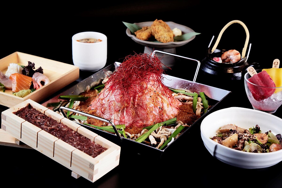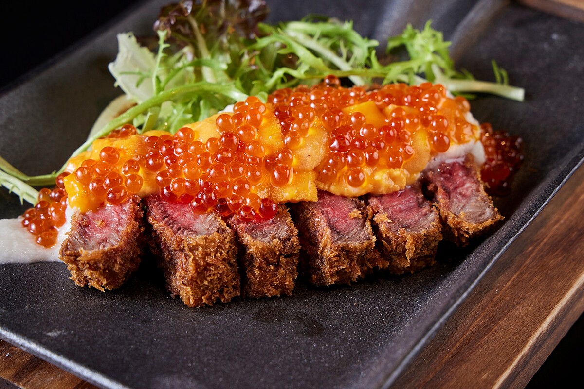 將澳洲M9等級和牛板腱牛排裹粉炸至金黃酥脆,內裡肉質約五分熟,豪邁鋪上滿滿的日本馬糞海膽、鮭魚卵,以鐵鍬造型鑄鐵盤裝盛霸氣上桌!濃郁海膽搭配鮭魚卵及牛排的完美組合,一口咬下暢享海陸頂級食材的奢華美味。