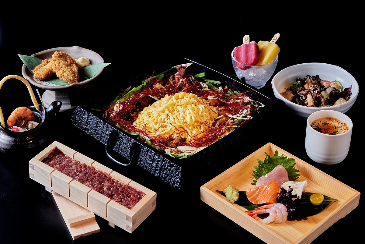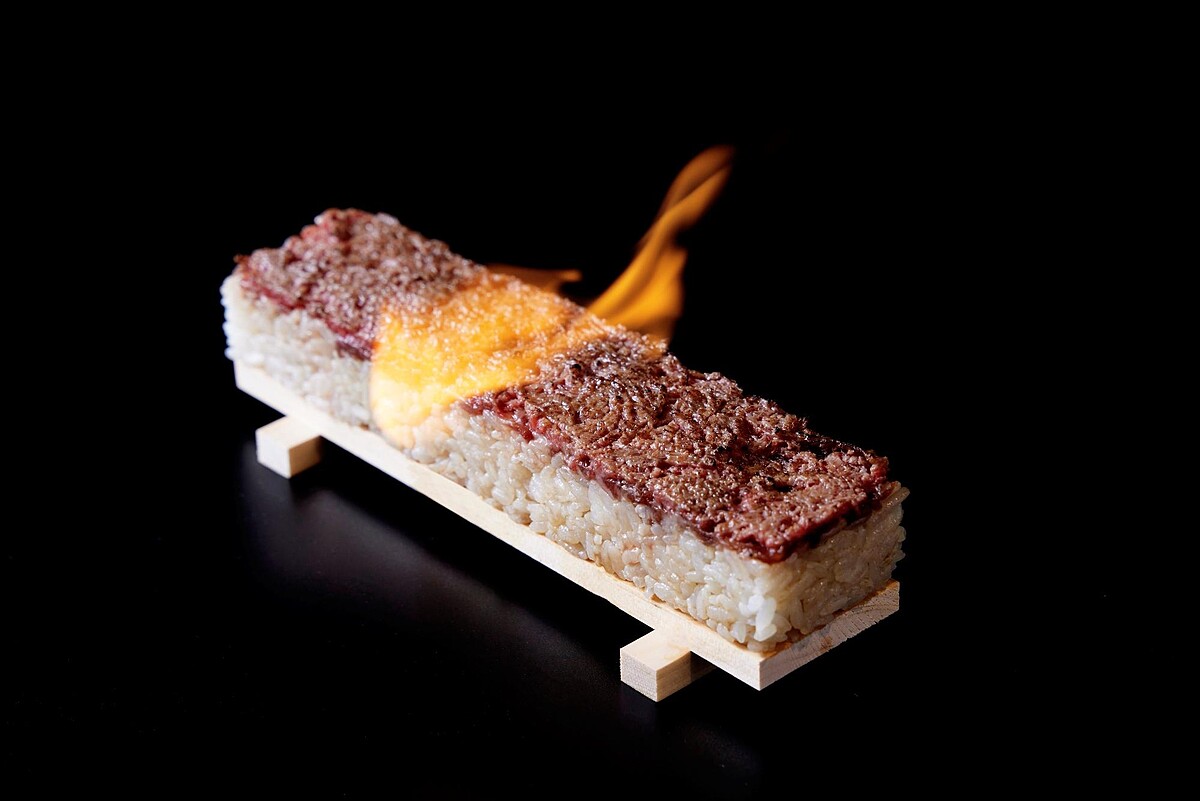 在酸甜開胃的醋飯上鋪上日本A5和牛生肉,再刷上秘製燒肉醬,裝盛在押壽司專用長方形木製模具中,桌邊壓取炙燒表面,以熱力融化牛肉油脂伴隨醬香,入口感受爽口醋飯及和牛脂香肉嫩口感。