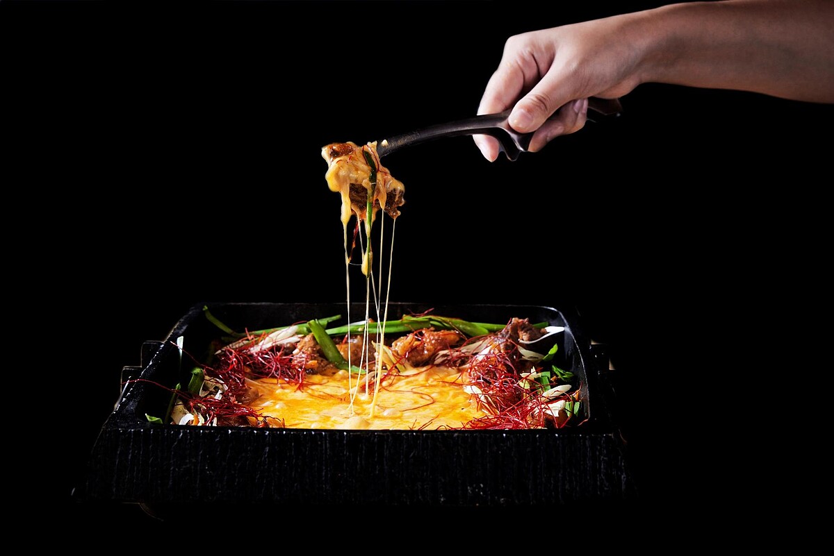在厚實鑄鐵鍋中霸氣鋪上滿滿的雙色起司,加入韓式辣醬及蔬果熬煮成秘製燒肉醬,再拌炒澳洲和牛肋條、牛臉頰肉、牛筋、牛肚、牛百頁等牛雜與台灣豬腸至入味,底部墊鋪銀芽。