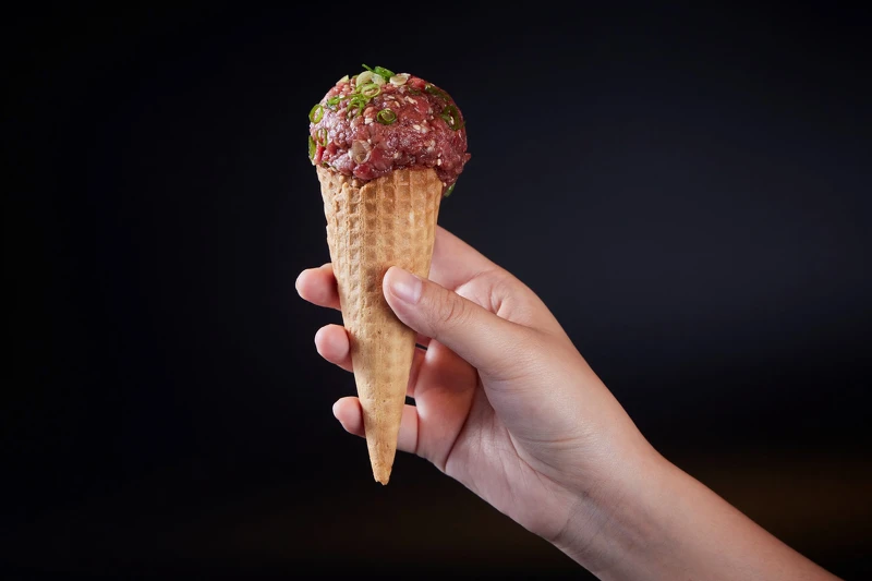 現場自製充滿蛋奶甜香的甜筒,先裝填生蛋黃,再放上一球加入了日本A5和牛手切生牛肉,和牛加入了麻油、秘製燒肉醬、白芝麻與青蔥調味。
