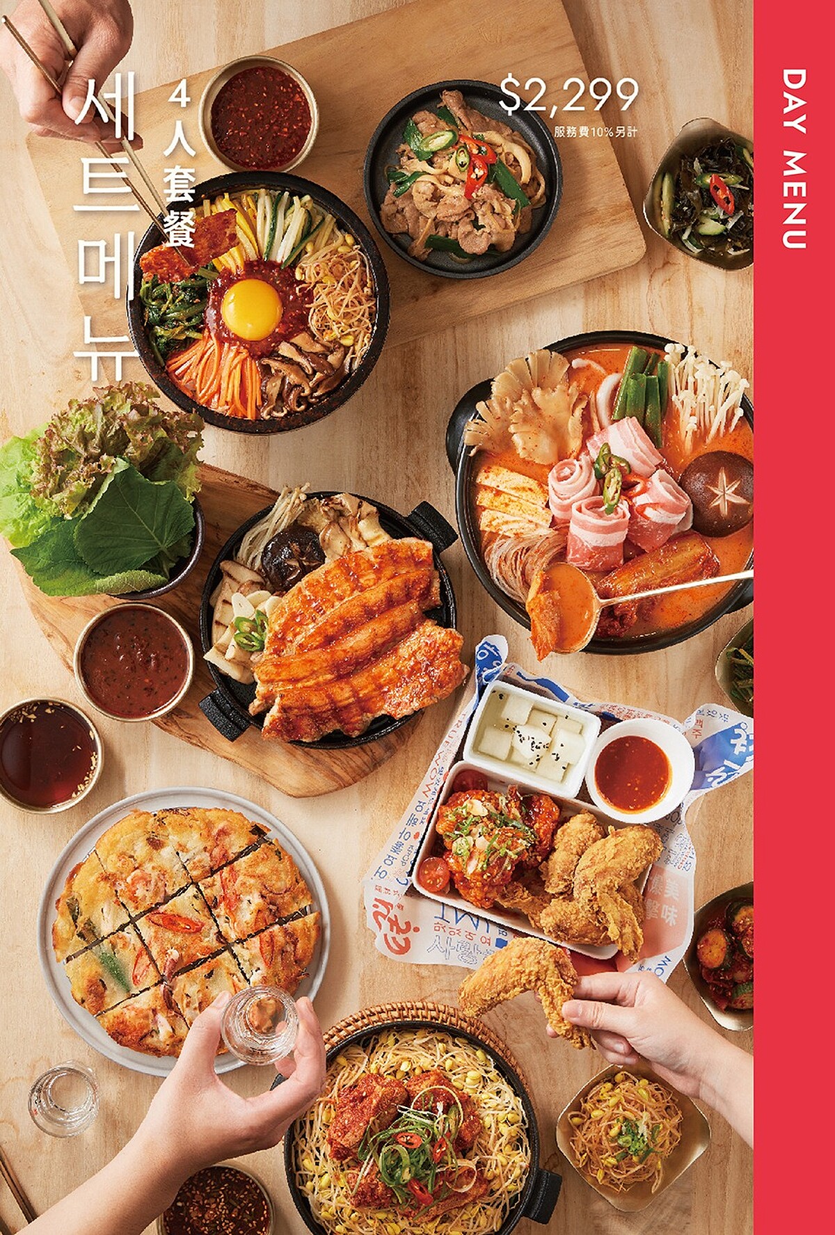 除了有雙人套餐的餐點外,更多了大勢韓味(祝咖嘿牛肉雜菜/辣炒魷魚豬肉/春川辣炒雞/大邱辣燉豬肋)4選1,半半炸雞也有新口味(金點不敗炸雞 原味/允指洋釀炸雞 甜辣/水原醬香炸雞 醬油/蜜是YOU炸雞 蜂蜜)4選2,絕對能讓大家吃得心滿意足!