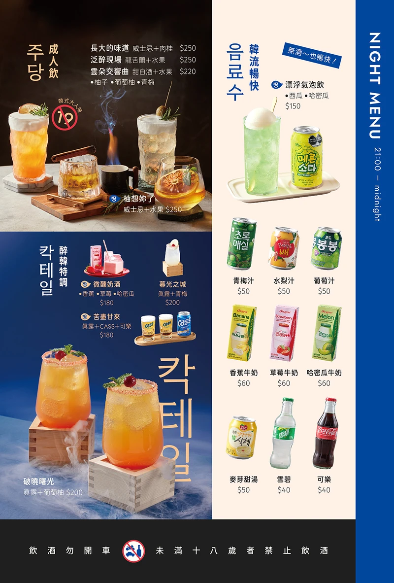 入夜後初瓦在晚上9點後的菜單為單點形式,推出一系列非常適合搭配酒類飲品一起享用的誘人炸物、半半炸雞、炸年糕,還有超浮誇的燒酒乾杯派對塔,以及暖心又暖胃的魚板湯、年糕煲、泡菜煲、辛拉麵鍋、海鮮煎餅、起司熔岩爆鍋蒸蛋、春川辣炒雞、辣炒年糕…等可以選擇。此外,還有販售韓式燒酒、各式酒類特調,如果不喝酒的人在這裡也能喝到人氣韓國飲品,真的超適合約姐妹們一起在這裡吃宵夜啊!