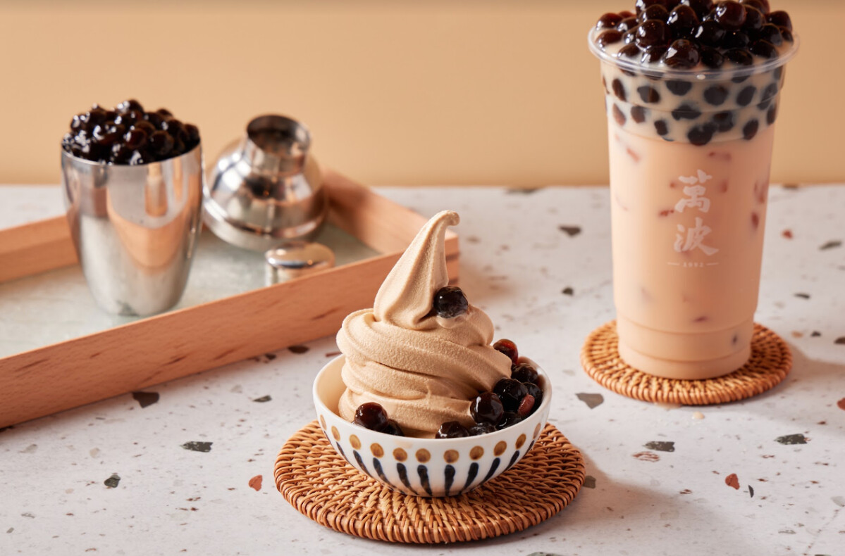 而「萬波奶茶霜淇淋」則將萬波招牌奶茶融入霜淇淋,每一口都嚐得到厚實茶味與濃醇奶香,還能夠自助添加紅豆與波霸配料,肯定是最完美結尾。
