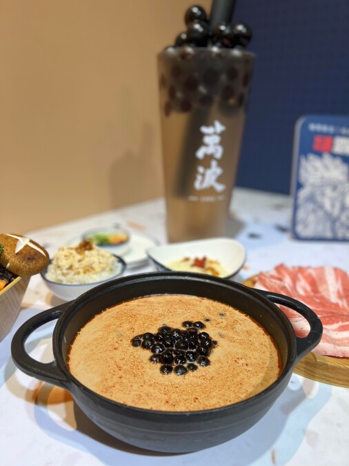 人氣手搖《萬波》和《尬鍋》在今年夏季首度跨界合作,將大家最愛的珍珠奶茶結合火鍋,端出年度話題焦點手搖鍋物,這次聯名的「啵霸辣奶鍋」加入萬波招牌島嶼紅茶,並利用溫火慢炒濃醇白醬,混合尬鍋特製辣醬,營造出微辣口感。