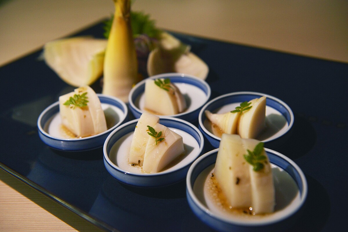 延續日本夏季餐桌美味的概念,料理長也特別將當季綠竹筍端上餐檯,並透過柴魚高湯熬煮的芥末醬汁調味,打造出口感爽脆的「和風綠竹筍」。