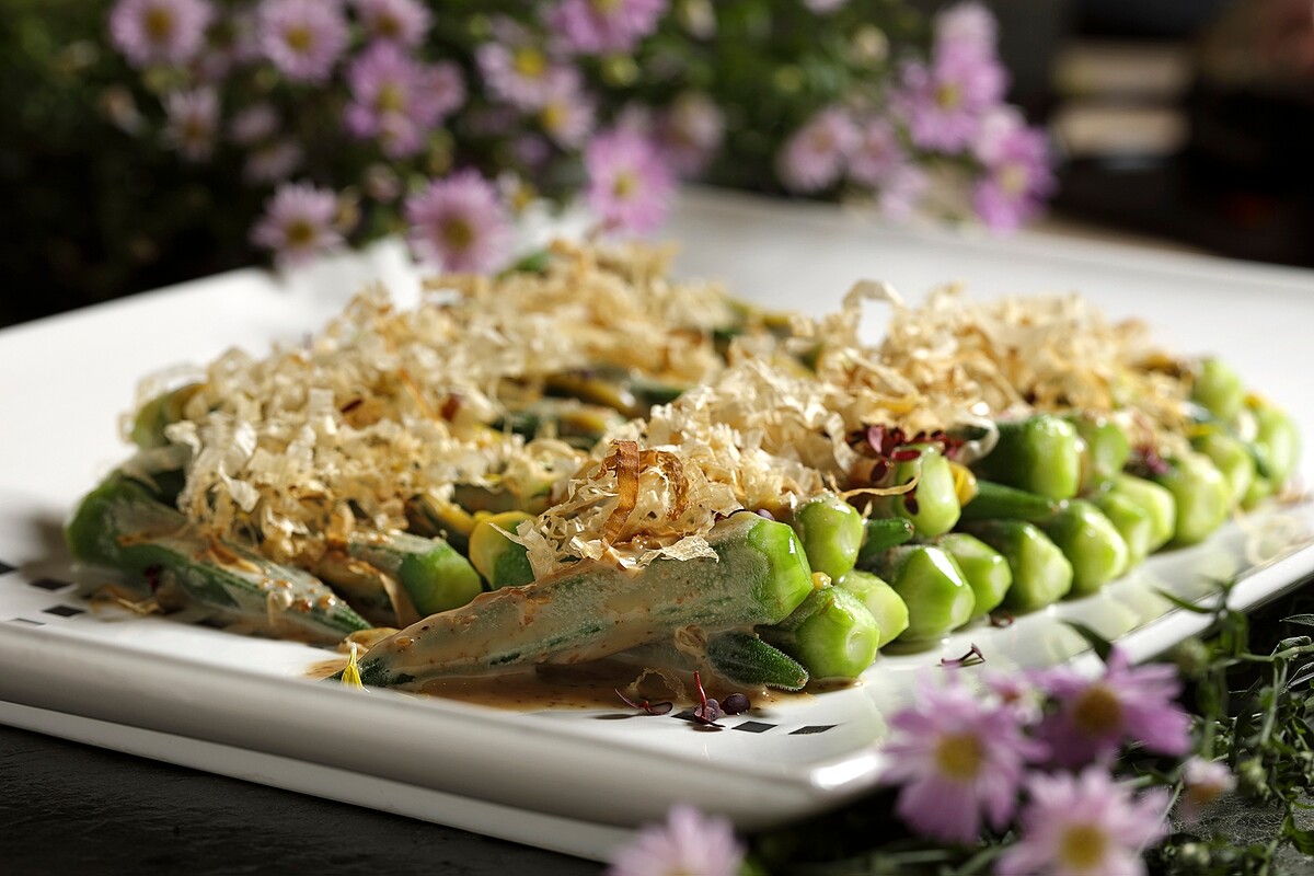 使用日本人喜愛的食材秋葵,以胡麻醬搭佐醋味噌的雙重醬汁,傳達日本人夏季餐桌的定番美味。