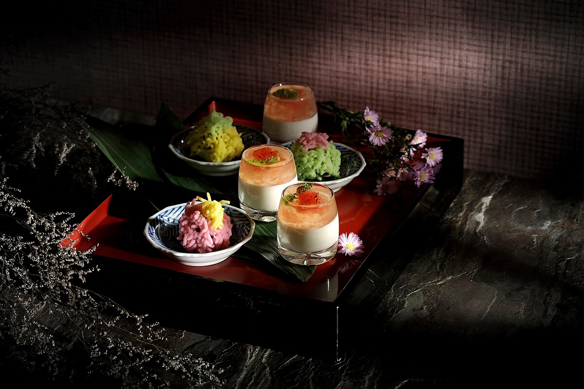 料理長以口感較為柔軟水潤的葡萄柚凍搭配奶酪,加上新鮮進口的鮮甜葡萄柚果肉,迎來夏季的清爽酸甜。以長芋蒸製研磨再過篩造型的繡球和菓子以紅豆泥入餡,淡雅微甜與細緻口感,更為餐檯呈現迷人的夏日風采。