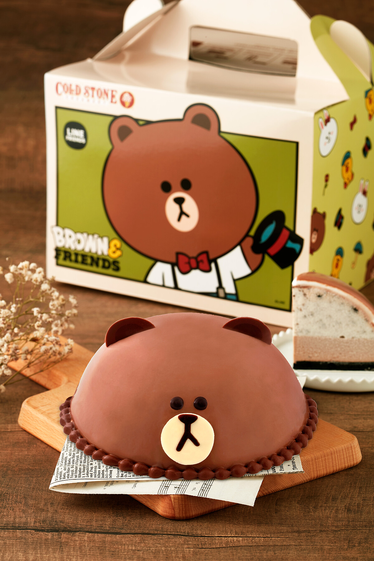 底層使用巧克力海綿蛋糕,再以酷聖石人氣香奶冰淇淋再OREO餅乾,搭配濃郁巧克力冰淇淋,一次擁有多層次的豐富口感!從包裝盒到冰淇淋蛋糕蛋糕都讓人充滿驚喜感!熊大立體頭型蛋糕,搭配限量專屬LINE FRIENDS旗幟組,可愛無死角,一秒融化大家的心啊!