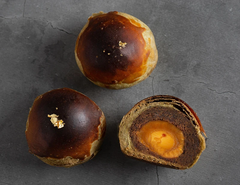 在烘烤過程中茶質釋出,讓外層酥皮自然呈現天然烏潤茶金色。此外,選用來自屏東大武山下醃製時間23天紅土鴨蛋,並使用60%橙皮酒醃製長達一天,費工耗時打造出膏狀且獨特的綿密口感,鹹蛋黃帶有淡淡橙酒香,非常迷人!