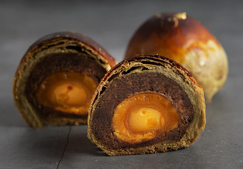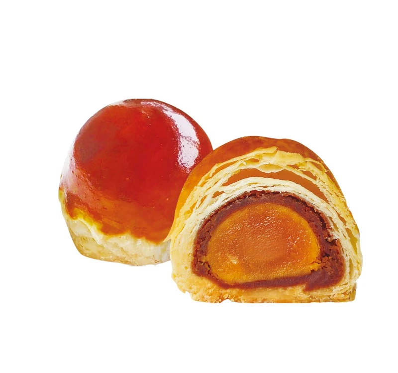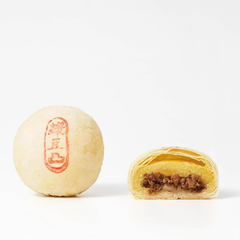 將新鮮鴨蛋黃揉成粉狀與經烘烤干貝拉成絲狀,再以上等綠豆仁、奶油、麥芽糖揉和而成的綠豆沙內餡,接著包裹上中式酥皮,灑上起司粉增味,讓整體更增添層次與豐富口感。