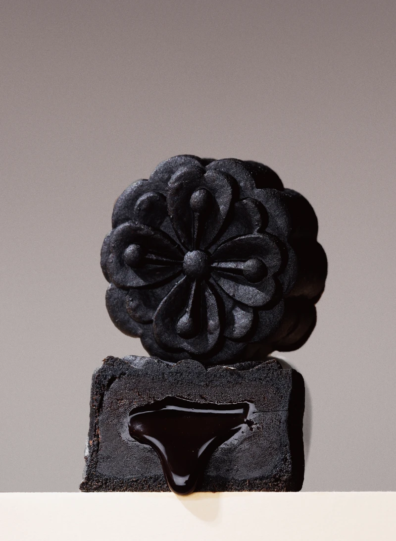外觀以優雅的花卉呈現,其使用來自日本桃山的和菓子餅皮,以白鳳豆沙取代麵粉,再加上特黑可可粉,讓口感更佳細膩輕盈。內餡則嚴選進口法國莊園級巧克力與榛果結合,裡頭再裹入巧克力熔岩流芯,咬下後醇厚的巧克力風味在口中擴散,甜而不膩的風味,令人愛不釋口!