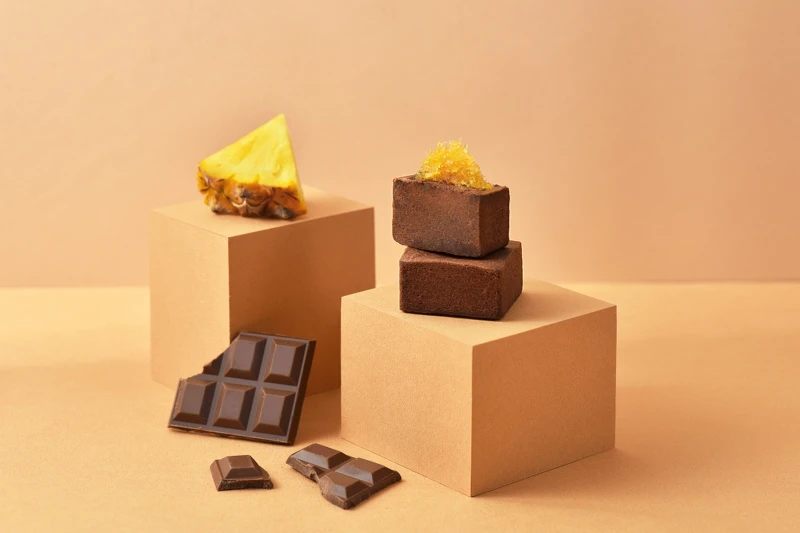 將傳統茶飲鐵觀音與當季鮮果荔枝融合,添加杏仁與果乾提升口感層次,外層再包覆70%黑巧克力,入口感受馥郁香氣及甘鮮風味。