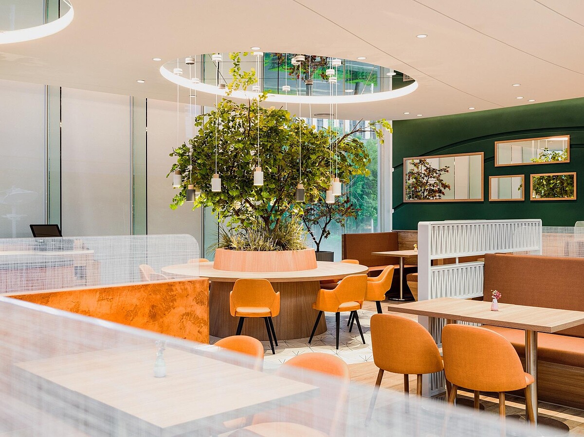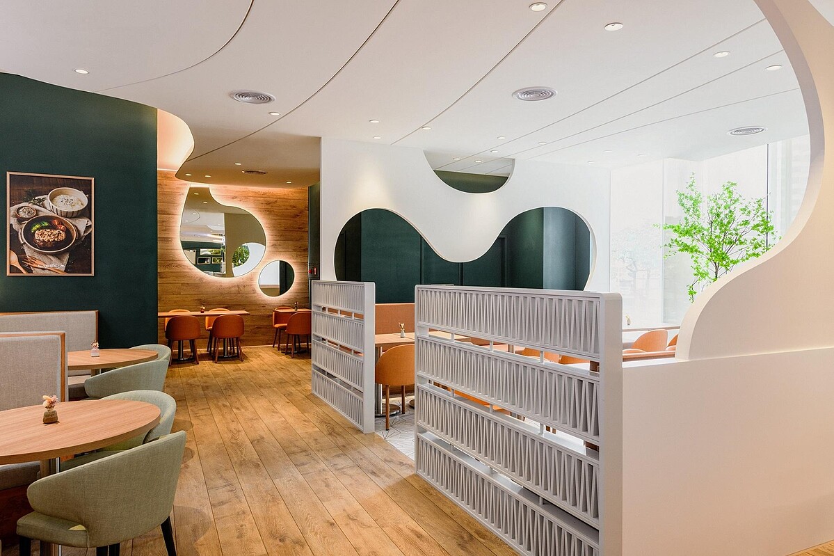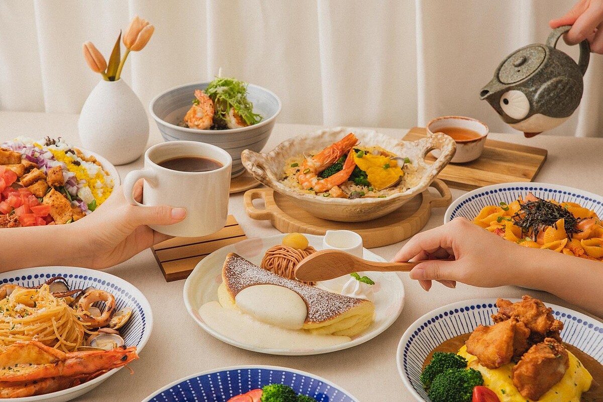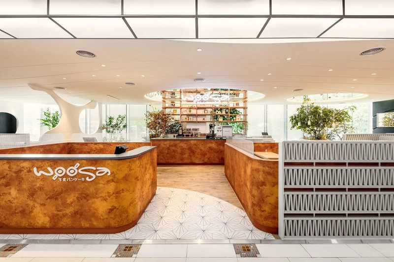 Woosa高雄大遠百全新概念店,以焦糖、棕橘色系配以綠樹與藍綠色調增添整體的舒適感。用餐空間的設計特別以招牌的「雲の鬆餅」為主軸,宛如雲朵般棉柔的形象、緩緩流動的蜂蜜為靈感,讓視覺以圓角弧線呈現,完美融入在店裝當中!