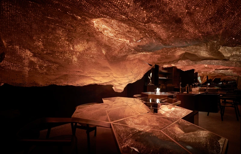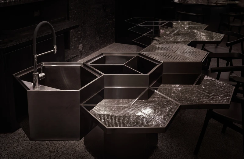 而蜂巢裝置結構可結合感應式的燈光呼吸系統,巢面能隨著音樂節奏、交談聲響、器皿碰撞聲而透出緩變的光色,隨著桌板鏡面材質映射的流動倒影,刺激著顧客的感官;另有獨立蜂巢吧台可服務12位賓客,精巧的空間透過燈光視覺延伸,營造出獨特、神秘的氛圍。