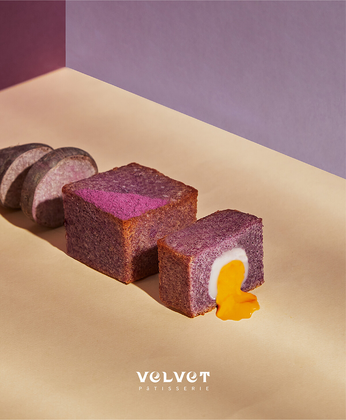 以充滿豐富的奶油含量與其扎實的磅蛋糕口感為基底,將紫薯粉柔棉密細緻蛋糕體中,將柔軟Q彈的麻糬揉進蛋糕體中,讓每一口都充滿紫薯與金沙濃郁香氣,甜而不膩的精緻口感。