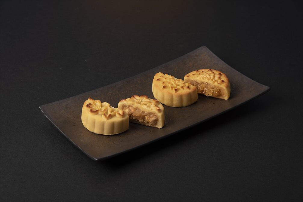 新口味「紅玉蘋果月餅」,嚴選了與蘋果酥相同的日本青森紅玉蘋果內餡,最特別的是加入了台灣經典的烤地瓜,以柔軟的地瓜泥搭配彈牙的蘋果果丁更增添整體的溫潤感。
