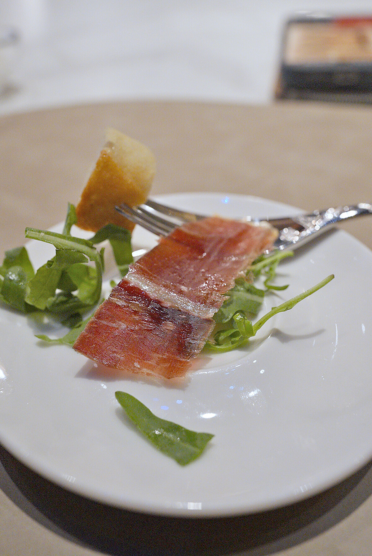 每年造訪產地拜訪職人,是主廚多年來的習慣,更於過去前往西班牙哈布果小鎮(Jabugo),透徹了解伊比利豬的神奇與歷史,以平均一公頃橡樹林放牧一隻豬的方式,讓豬隻盡情吃落滿地的橡樹種子,快速增加脂肪的厚度與香氣。熟成的伊比利火腿除了有36及48個月,甚至還有60個月之久,片開後深紅色肉片襯上乳黃色大理石油花,光透清晰明顯,油潤的榛果香氣口頰留香,吃過一片就會終身難忘。