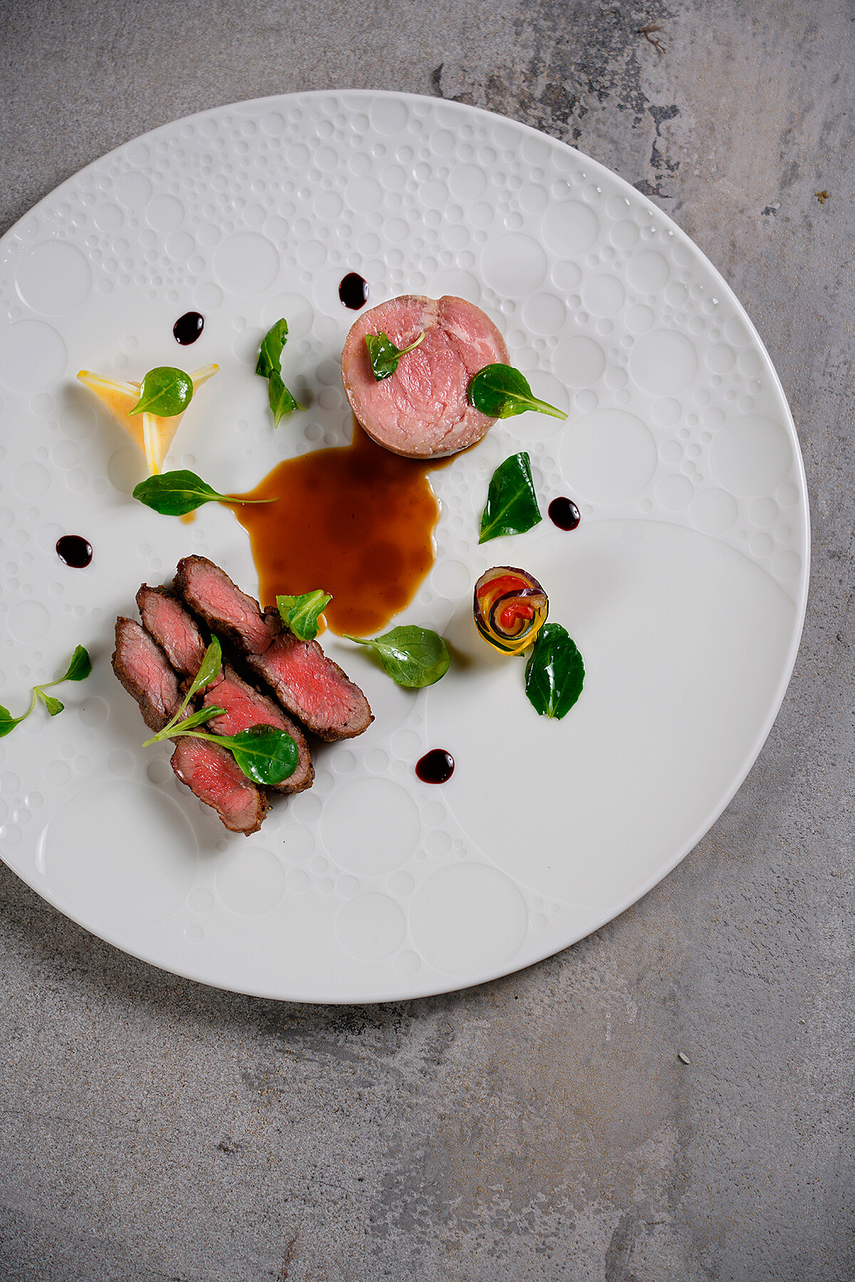 西班牙伊比利黑豬是世界最珍貴的豬肉之一,豬肉帶有橡果香味。主廚取一頭豬僅有兩塊的上蓋肉,煎烤後,能品嚐到油脂帶來外酥內Q彈軟嫩的肉質;另一塊豬小里肌腰脊肉,沒有多餘油脂肉質細緻,利用超音波震盪機,將肉恆溫五至七分熟,非常柔嫩驚奇,是道能同時可以吃到兩種伊比利豬的口感的主菜,搭配的是法式燉菜和大根蘋果南瓜泥迷你餃,並點綴上波特酒膏。