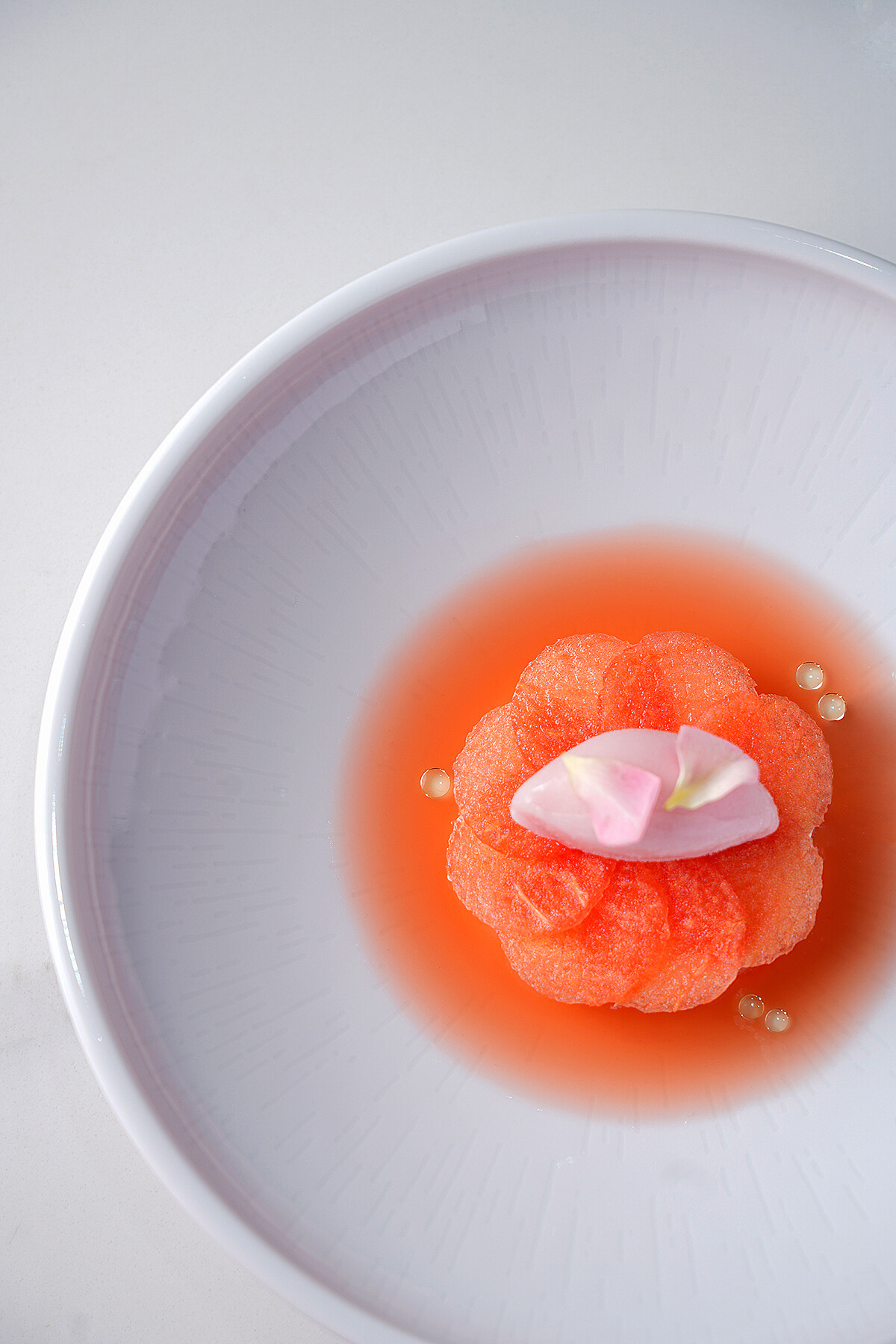 使用台灣華寶西瓜,底層為白色的荔枝冰糕包藏西瓜白玉、荔枝肉還有小薏仁,精巧疊上西瓜圓片和自製的嫣紅色玫瑰雪葩,緩緩注入西瓜冷湯,季節感十足。