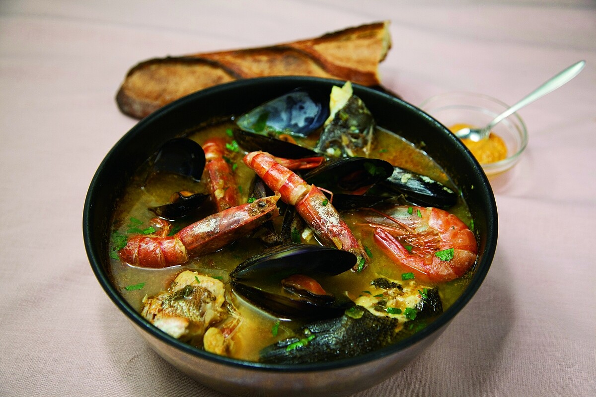 作法:1.魚切塊,以平底鍋煎外皮。2.馬鈴薯削皮,切成方便食用的大小。番茄滾水去皮切塊。如果有番紅花,以研磨缽等工具磨碎。3.起油鍋,炒香蒜末後加入洋蔥,炒至透明。4.加入白酒、2、1L的水、魚高湯熬煮。5.馬鈴薯煮熟後,加入魚塊、淡菜、蝦子等煮熟。加鹽、胡椒調味。6.盛盤,搭配rouille 蛋黃醬和長棍麵包。