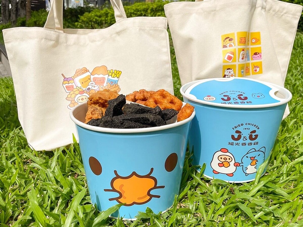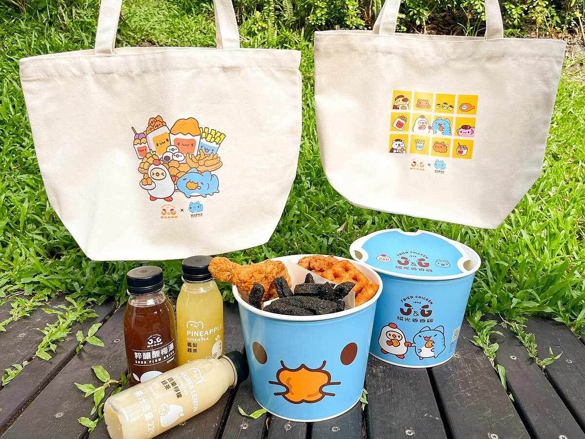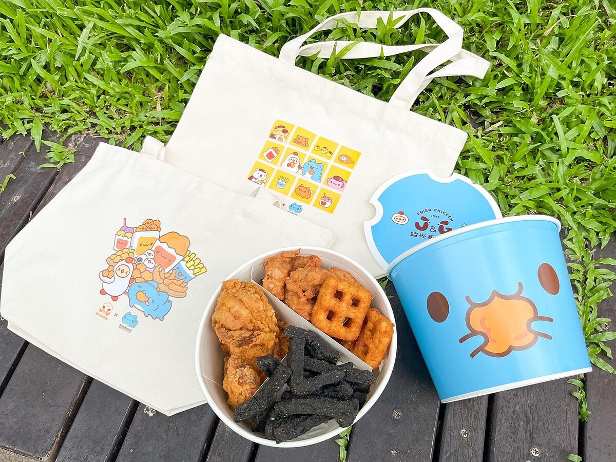 香香肉肉桶內容物:大份香香炸雞1份+咖哩炸雞2塊+墨魚甜不辣+田字薯餅2份,套組限量附咖波聯名提袋乙個(共有兩款,恕不挑款,數量有限售完為止)。