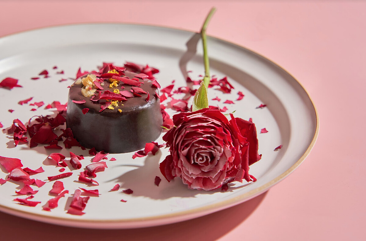 結尾的甜點則是浪漫升級,「女王蛋糕」使用大量黑巧克力結合脆餅製成,並挑選來自屏東和南投在地自種的有機食用多花瓣玫瑰,藉由浸泡-196度的液態氮營造煙霧氤氳,並化成玫瑰雨落在女王蛋糕上,絕對是美照必拍甜品。