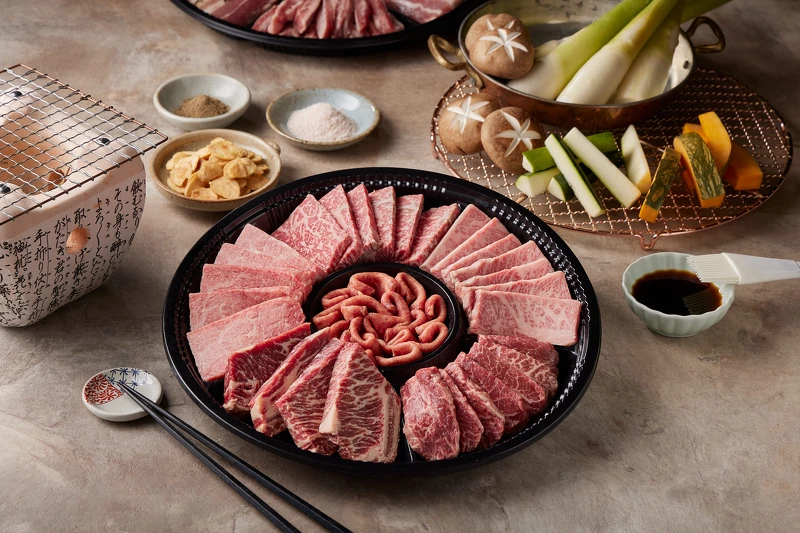 主打日本產地直送黑毛和牛,遵照日本傳統職人手工工法分切每塊肉品,4款黑毛和牛肉品,包含黑毛和牛特選嫩肩、黑毛和牛赤身牛排、黑毛和牛特選牛五花、黑毛和牛內胸肉片,以及美國無骨牛小排、美國特選牛肩、澳洲橫隔膜燒肉片與國產活菌豚肩肉,頂級肉品一次滿足,每口都能感受正統日式燒肉的美味與職人堅持,絕對是中秋燒肉組合的首選之一!