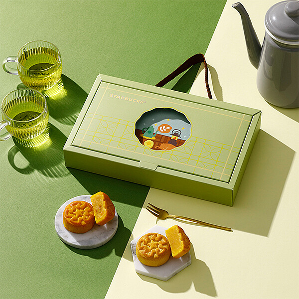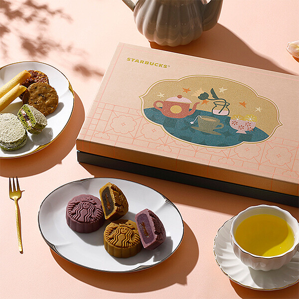 外盒以西式的花型窗花設計,古典又優雅,打開禮盒,能夠享用桃山餅皮結合星巴克義式咖啡粉製成的「焦糖那堤藏芯月餅」、香甜不膩的「紫薯奶皇藏芯月餅」、「抹茶草莓達克瓦茲」、「巧克力核桃燕麥餅」,還有百吃不膩的「海鹽奶油捲」、與可可核果塔4款小點,再搭配茶飲或咖啡一起享用,就是最佳的中秋佳節最佳的下午茶組合!