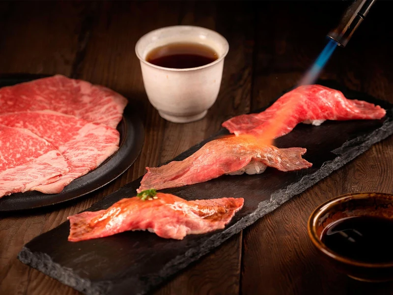 極上和牛雪花、極上和牛胸腹肉、安格斯雪花牛、安格斯霜降牛、脆皮豬五花、梅花豬肉、國產滑嫩雞腿肉。炙燒和牛壽司一貫。