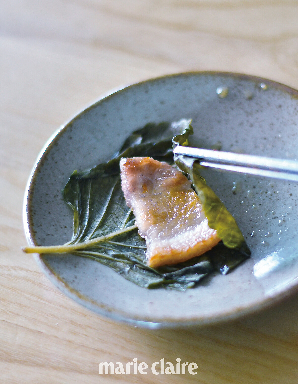 Tips:「劇裡的醬漬小菜使用的是茗荑葉(명이나물),由於該食材在台灣取得不易,因此改為製作醃漬紫蘇葉,也是相當常見的烤肉小菜搭配。醃漬後的紫蘇葉味道酸甜,包著肉一起吃相當解膩美味。」