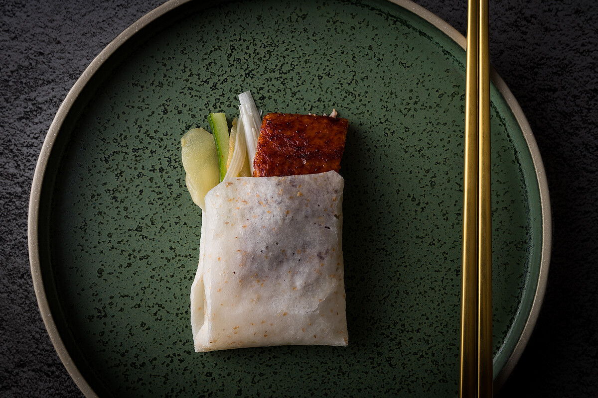 挑選具有肥厚油脂的75天飼養宜蘭北京種鴨,歷經繁瑣製作過程後,有著光澤油量外皮。口感外酥內嫩、皮脆有嚼勁,搭配捲餅、甜醬、蔥,及獨家配料甜薑片,一入口香氣直撲鼻腔,鹹中帶酸甜,想一口接一口!