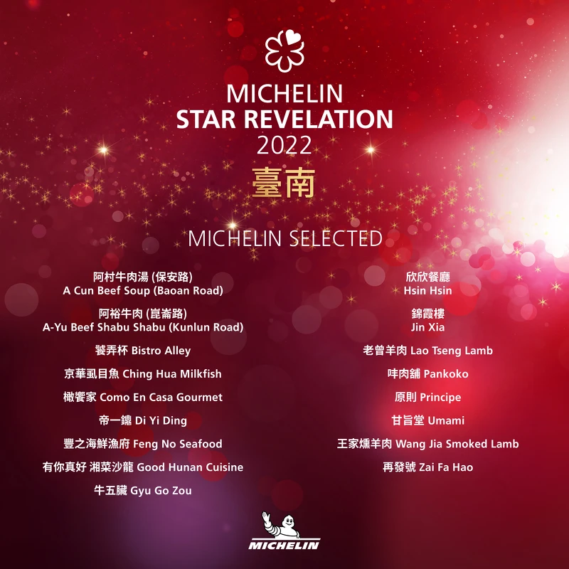 而首度納入米其林指南評選的臺南,同時也是四城中擁有最多新入選必比登推介的城市。這次雖未有摘星餐廳,但米其林評審員仍有17 家臺南推薦餐廳 ,其中臺灣菜餐廳有《欣欣餐廳》、《錦霞樓》以及《王家燻羊肉》,還有《阿裕牛肉 (崑崙路)》、《牛五蔵》等火鍋,其中包括了各式燒烤、海鮮、時尚歐陸菜、時尚法國菜、湘菜、日本菜及西班牙菜、小吃等多元種類的料理,讓老饕們可以來一場美食巡禮!
