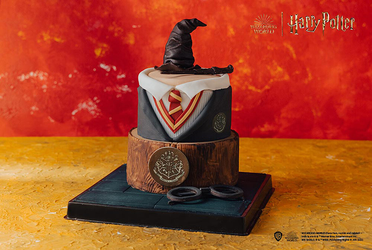每日限量的翻糖蛋糕超值得帶回家!不僅外在完美復刻電影中哈利剛入學的標配:學院分類帽、哈利波特魔杖與眼鏡,連內部都頗具巧思,蔓越莓紅醬搭配黃色系的原味奶香費南雪蛋糕體,代表了哈利被選進的葛來分多學院配色,明天就來訂一顆。