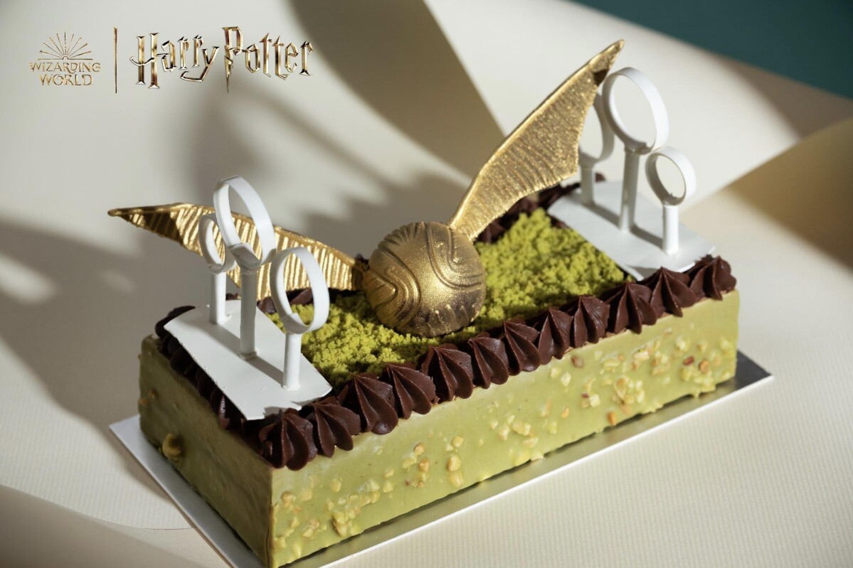 主廚將加入櫻桃醬、榛果奶油霜及開心果碎粒翻糖的榛果海綿蛋糕,作為魁地奇球場,並選用72%法國黑巧克力撒上金箔粉來打造超逼真「金探子」,現在你也可以學哈利,把金探子放入品嚐了!