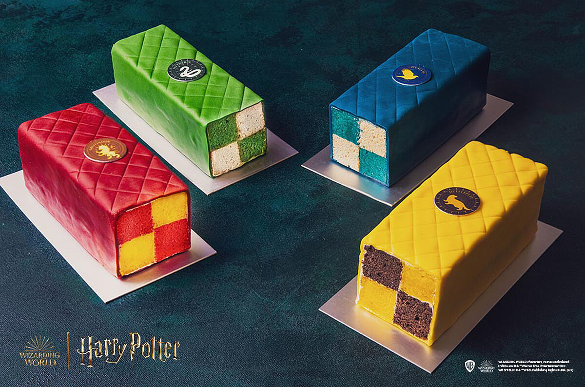 你是哪個學院?磅蛋糕一口推出分別為葛來分多(覆盆莓芒果)、史萊哲林(抹茶牛奶)、雷文克勞(藍莓香草)、赫夫帕夫(香蕉巧克力)4款,刻上菱格紋外觀、雙色蛋糕體令人捨不得吃!