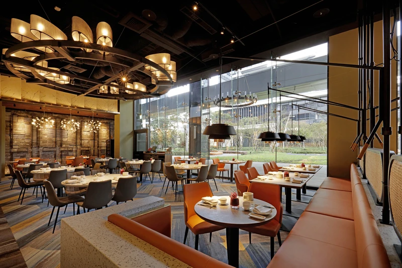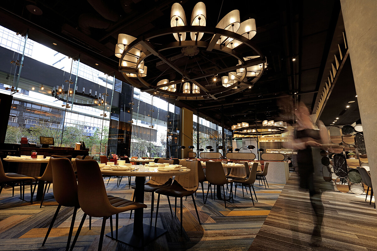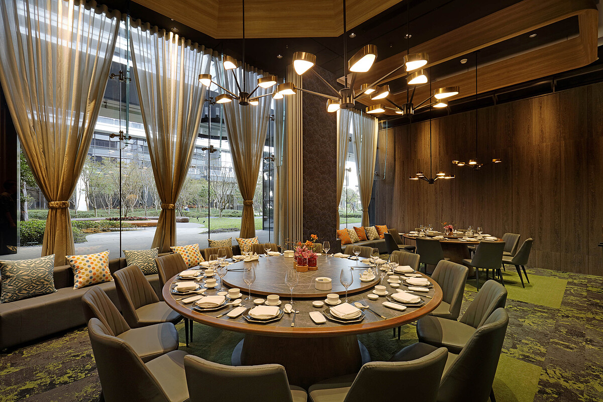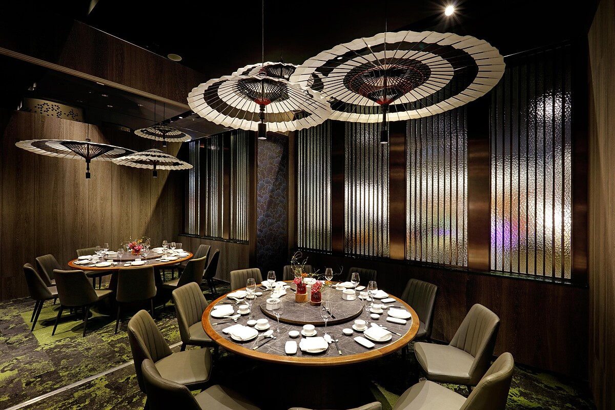而室內座位巧妙呼應著戶外公共空間的庭園綠意,讓饕客們能夠感受到舒適及開闊感。而對大花園的兩座大包廂則以西式吊燈呈現出華麗尊榮感;小包廂最讓人驚喜的是吊燈以美濃紙傘改造而成,空間充滿濃濃台式風情,卻又不失典雅。