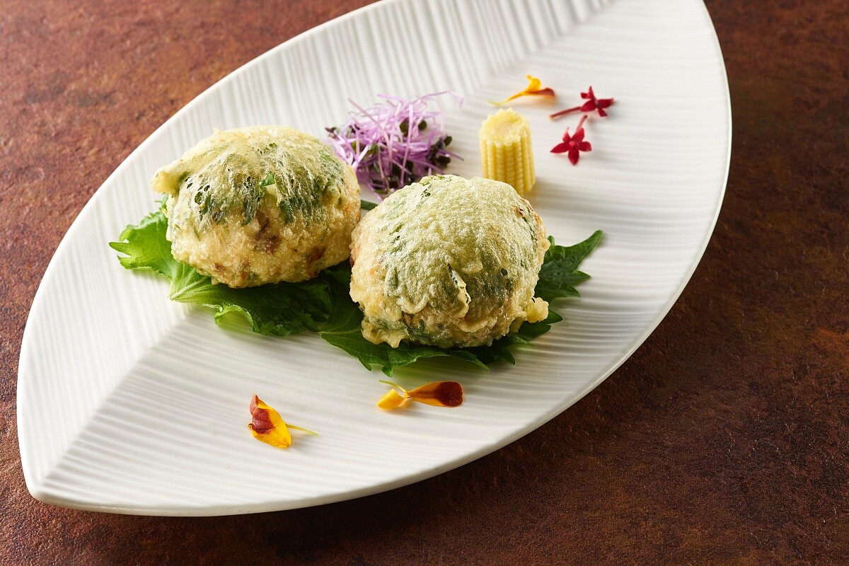 主廚特選高雄岡山傳統老牌豆醬為基底,再搭配豆腐乳、米酒且不摻任何一滴水,藉由稍乾的豆醬燜煮處女蟳,處女蟳不勾芡,僅以蟹肉自然濃稠香氣融合,打造出吮指回味的美味!