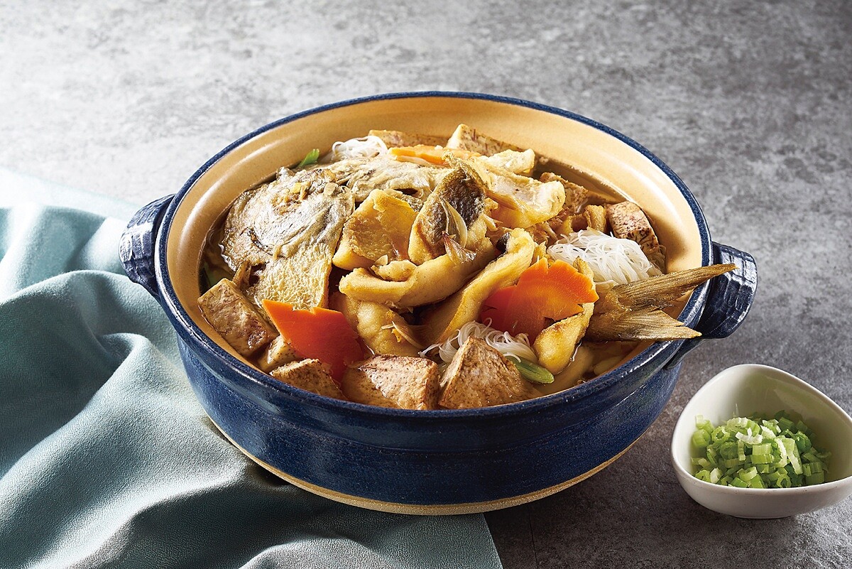 嚴選1公斤以上的新鮮白鯧切塊,與大甲芋頭分別下鍋油炸定型增加香氣!再加入肉絲、香菇絲、蒜苗、金勾蝦爆香後,倒入高湯大火煮滾,接著加入炊粉小火煨煮至入味,最後依序放入芋頭、魚塊,上桌前撒上自炸蛋酥、芹菜珠,湯頭溫潤甘甜,伴隨著芋頭香氣,鯧魚口感細緻滑嫩,令人一吃就愛上!