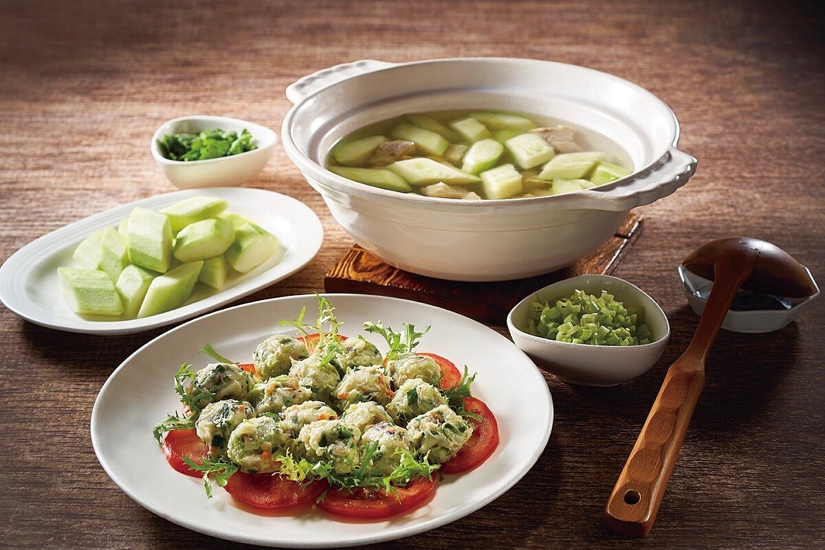 以古早味炸菜丸為靈感,而自家製的菜丸不經過高溫油炸,對於花枝漿、蝦漿等手工打至黏稠更加講究,每日新鮮現做,標榜不加入粉漿影響其口感!湯頭則是採用冬菜、排骨一起蒸過的高湯為基底,沒有過度調味的湯頭,更完整的呈現了季節瓜類、豬小排熬出的鮮甜肉香!