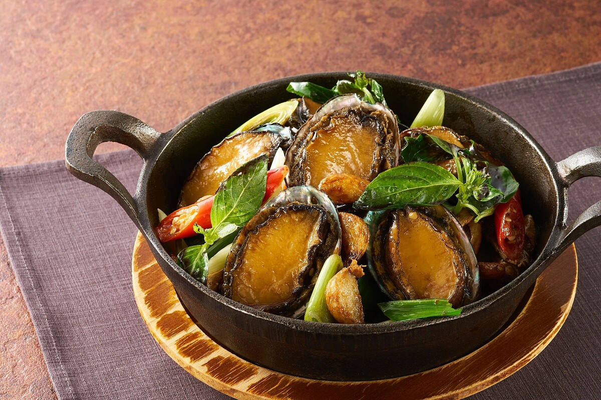 將台菜經典的三杯雞風味作為延伸,改採用北台灣養殖的九孔鮑、杏鮑菇取代雞肉。看似風味濃厚,其實主廚別具巧思僅安排杏鮑菇扮演口感爆汁,滋味濃厚一角,而九孔鮑則主要訴求略扒附著三杯醬汁的鹹香,品嚐時感受海鮮的鮮美,且整體風味不過於重鹹!