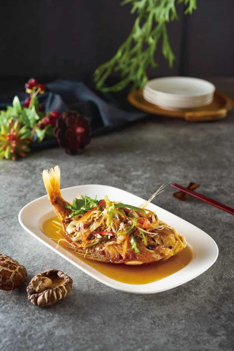臺菜中的經典古早味「五柳枝」,相當考驗廚師的刀工、食材及火侯的掌控!嚴選10兩以上赤鯮以高溫油炸,在炸的過程中一邊將魚身塑型成悠游靈活的模樣!再搭配約9種不同的食材細切成絲,如:紅蘿蔔、大白菜香菇、筍、青椒、洋蔥、番茄…等。再以糖、白醋勾芡製成酸甜開胃的五柳醬,接著淋在酥脆金黃的鮮魚上,入口感受酸香及清爽口感,每一口都讓人超滿足!