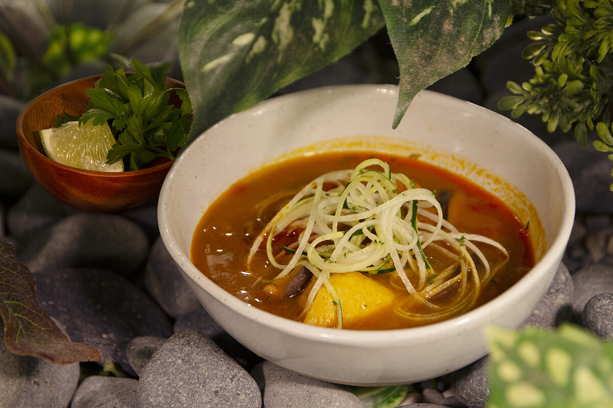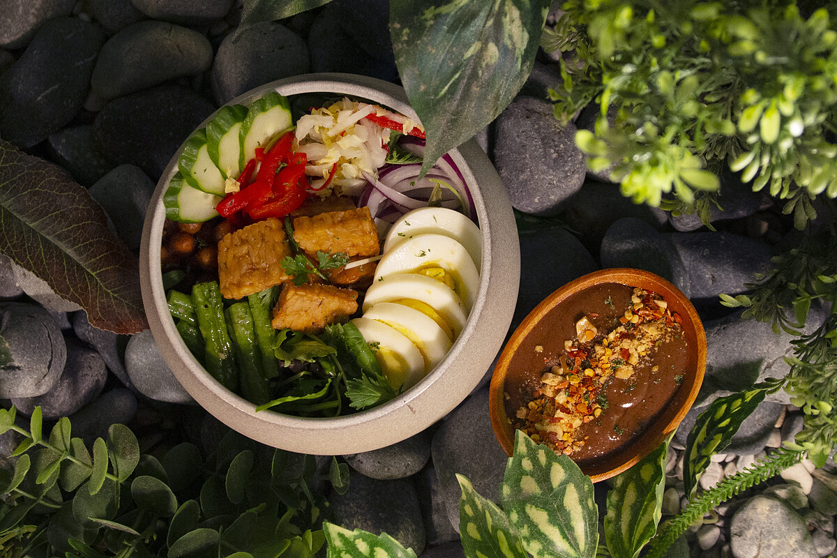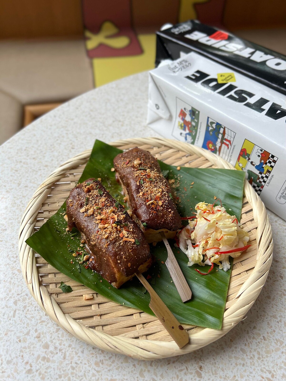 《小小樹食》X OATSIDE以南洋主題蔬食餐點為主,共推出兩道開胃菜、一道湯、佛陀碗,還有甜點與果昔,其中「沙嗲烤臭豆腐串」、「新加坡辣炒沙爹天貝佛陀碗」皆是使用「OATSIDE 巧克力燕麥植物奶」製成的巧克力沙嗲醬帶出獨特香氣。