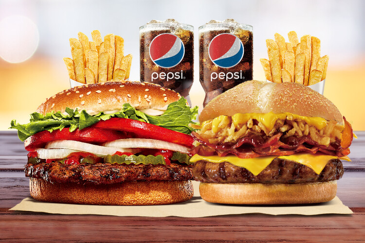 漢堡王祭出六大品項買一送一,包含全新上市優惠券限定香濃起司脆雞堡兩個只要109元,還有中杯百事可樂、中份薯條、辣薯球與兩款牛肉堡…等。