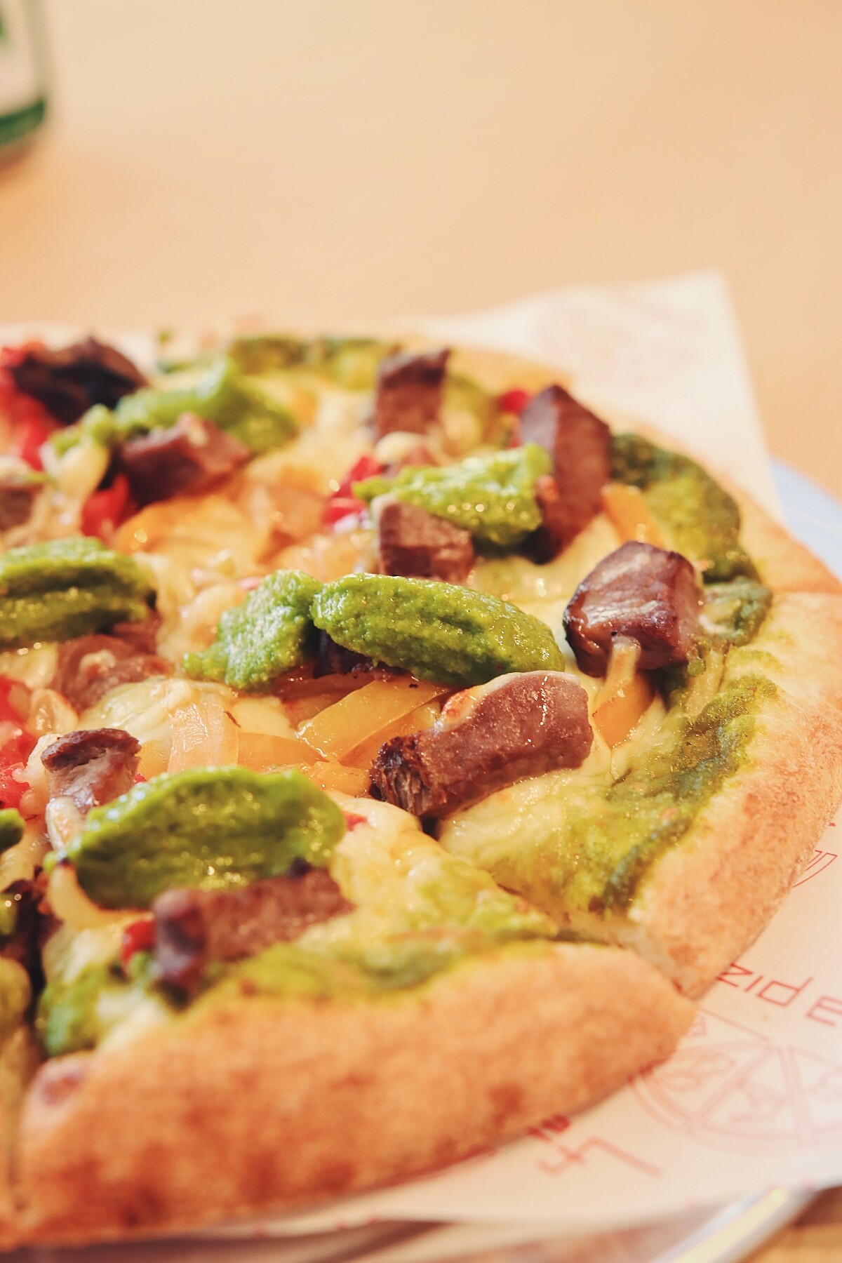 Farina Pizza 法里娜披薩的餅皮屬薄皮但非薄脆口感,經過發酵與烘烤後,具有蓬鬆的空氣感,些許厚度帶來優質麵粉經過揉捏後帶來的彈性,採專業的軌道型烤爐烘烤,口感外酥脆內層卻又帶有Q軟的咬勁,在細細咀嚼後,即能吃到乾淨的麵粉香氣。