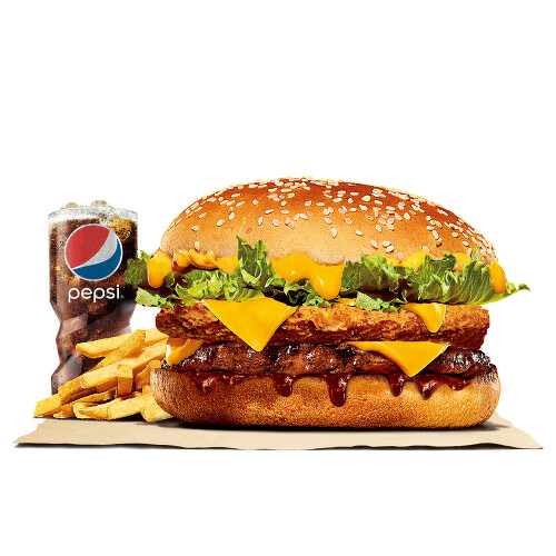 以Burger King招牌經典的火烤牛排搭配外酥內嫩的脆雞,再淋上香濃的黃金起司醬與BBQ醬,夾入生菜及美式起士片,多層次的口感與雙重美味,每一口都讓人超滿足!此外,只要再加20元即可升級套餐,還能夠吃到薯條及可樂,讓大家省荷包之餘也能吃得飽!